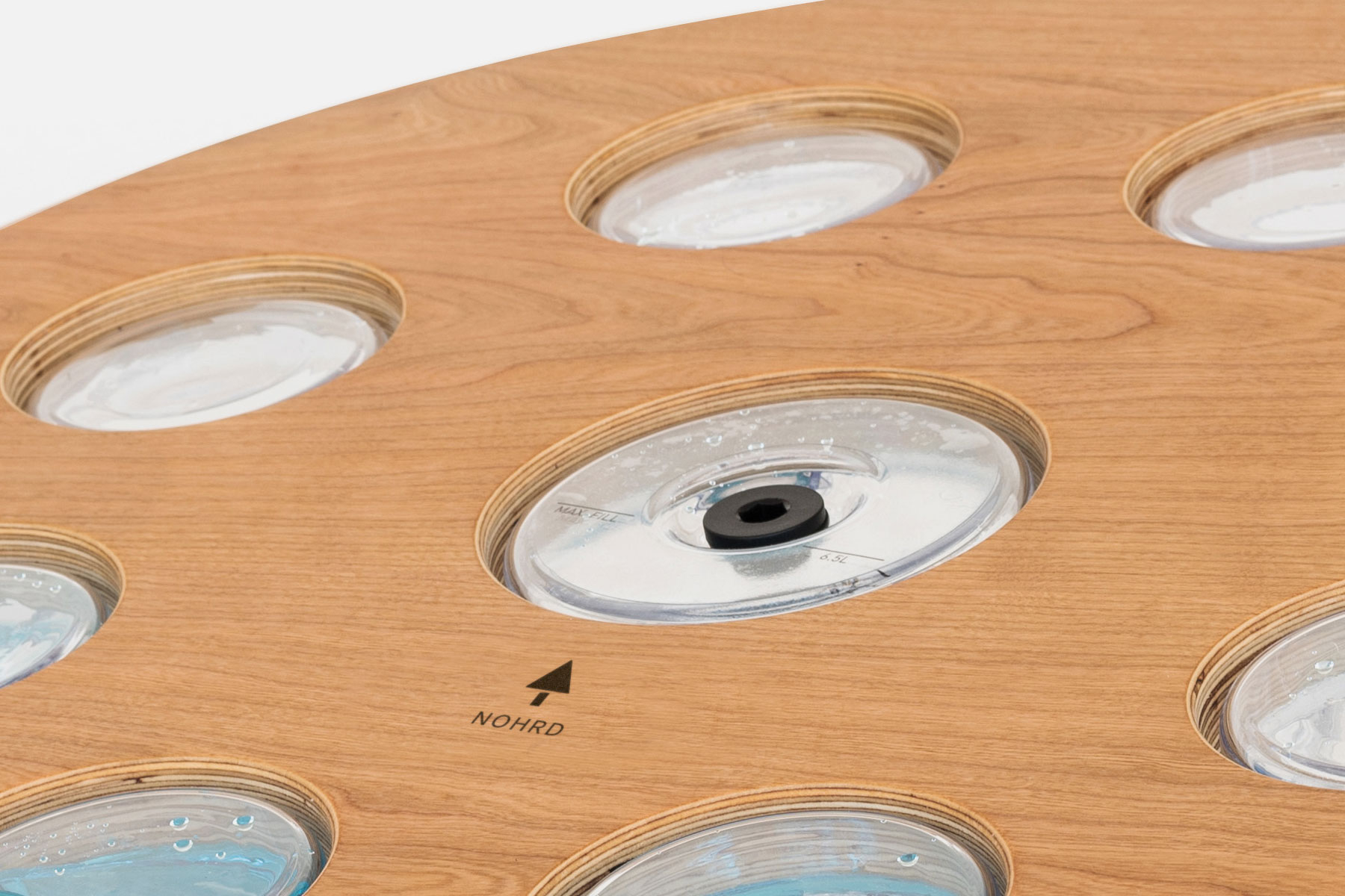 Mit einer Fußplatte aus Echtholzfurnier und einem Durchmesser von 64 cm beeindruckt das Eau-Me Board mit einem robusten Kunststoffgehäuse, das mit ca. 6,5 Litern Wasser gefüllt ist.