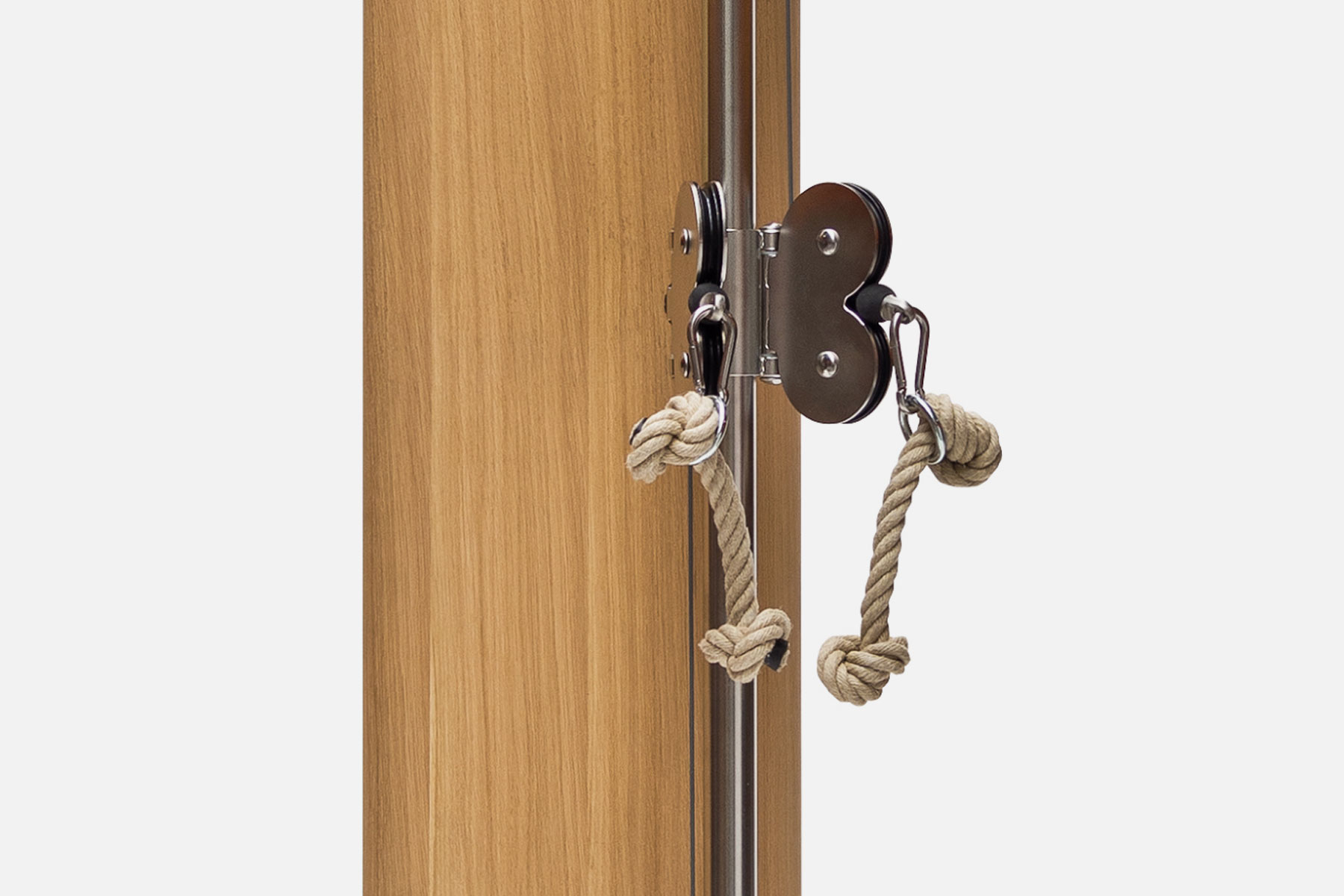 Die integrierte Klimmzugstange aus massivem Holz lässt sich in der Höhe verstellen und kann optional zur Latzugstation umgerüstet werden.