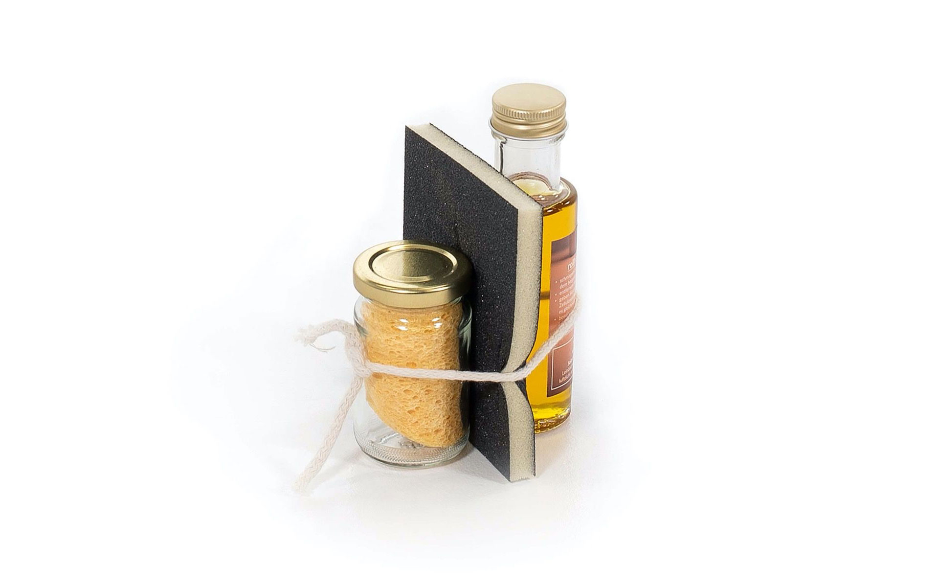Das rollholz Pflegeset dient der einfachen Pflege und Nachbehandlung der rollholz Produkte. Der im Set enthaltene Schleifschwamm ermöglicht ein einfaches Abschleifen des zu pflegenden Produkts. Natürliches Leinöl verleiht die nötige Pflege und verströmt einen wunderbaren Duft, sobald es mit Ihrem rollholz Produkt in Verbindung kommt.