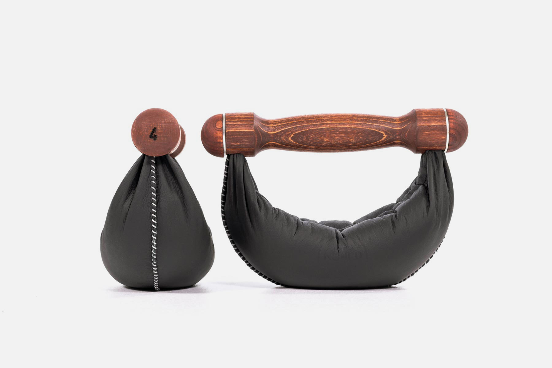 Hochwertige Swing Hanteln aus schwarzem Echtleder und mit massivem Vollholzgriff aus rot-braun gebeiztem Buchenholz.