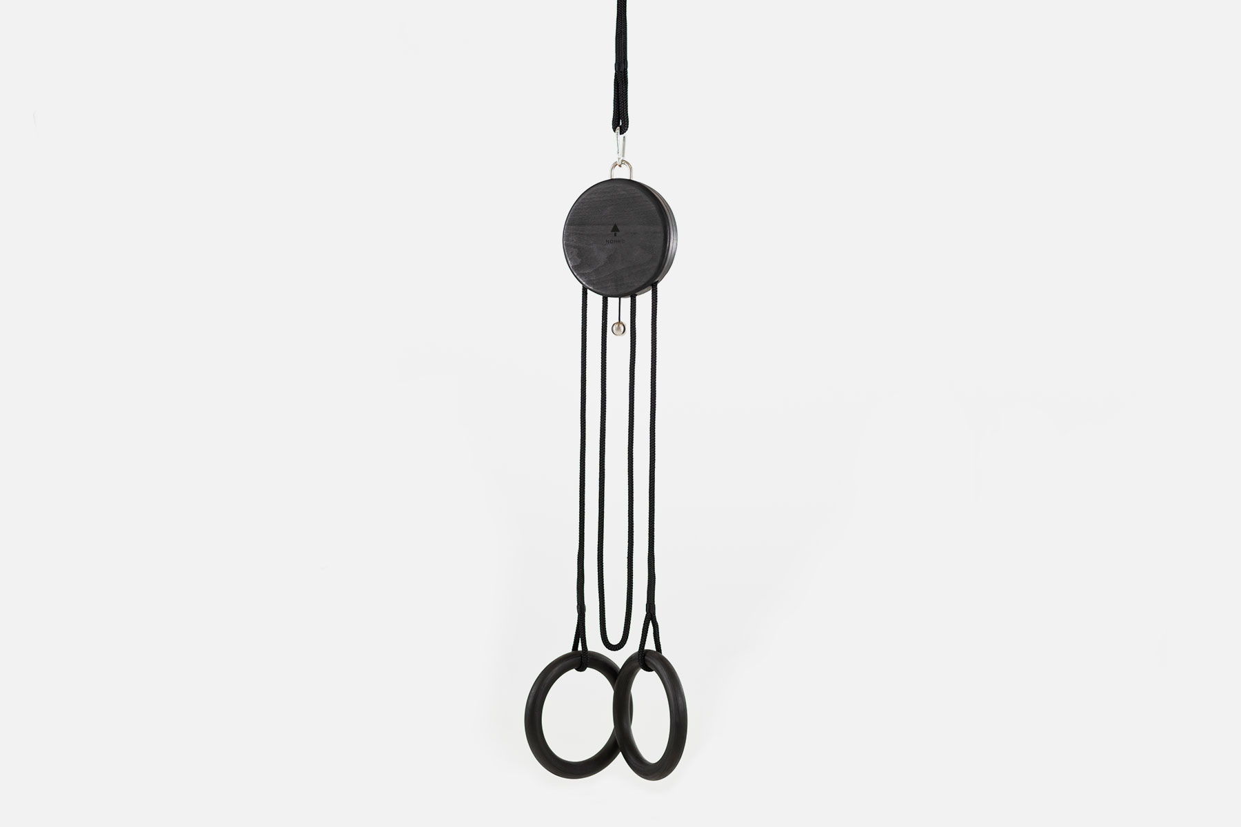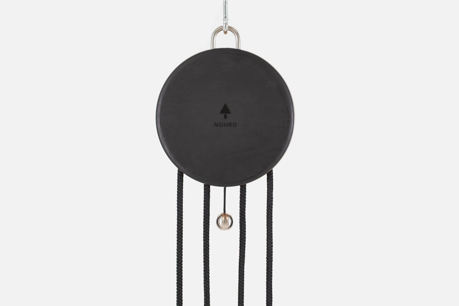 The solid oak housing of the quick-adjust mechanism, paired with the 24 cm diameter black-stained ring, gives the NOHRD Sling suspension trainer a natural touch and feel. The Sling can be easily attached to the ceiling or a tree branch by the included carabiner.