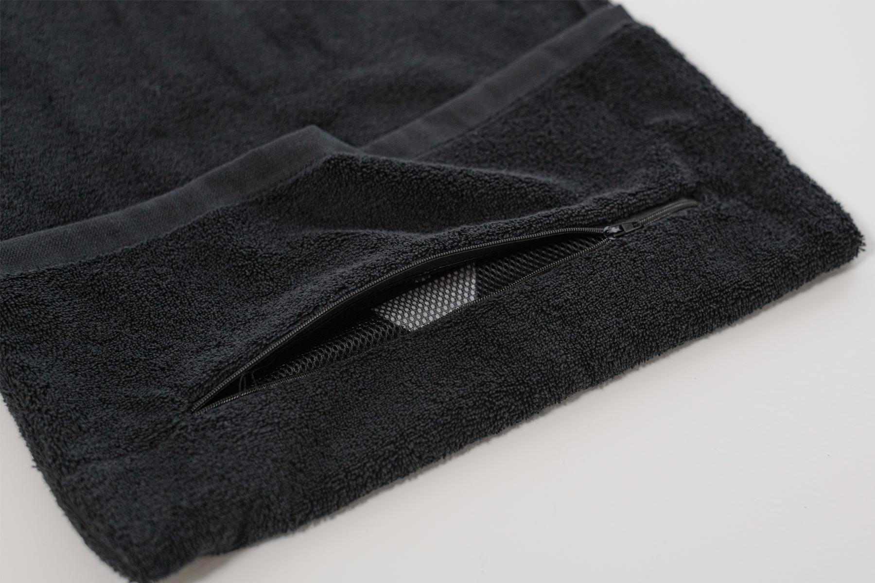 Black cotton towel with NOHRD logo. Includes zipped pocket for cell phones or valuables.