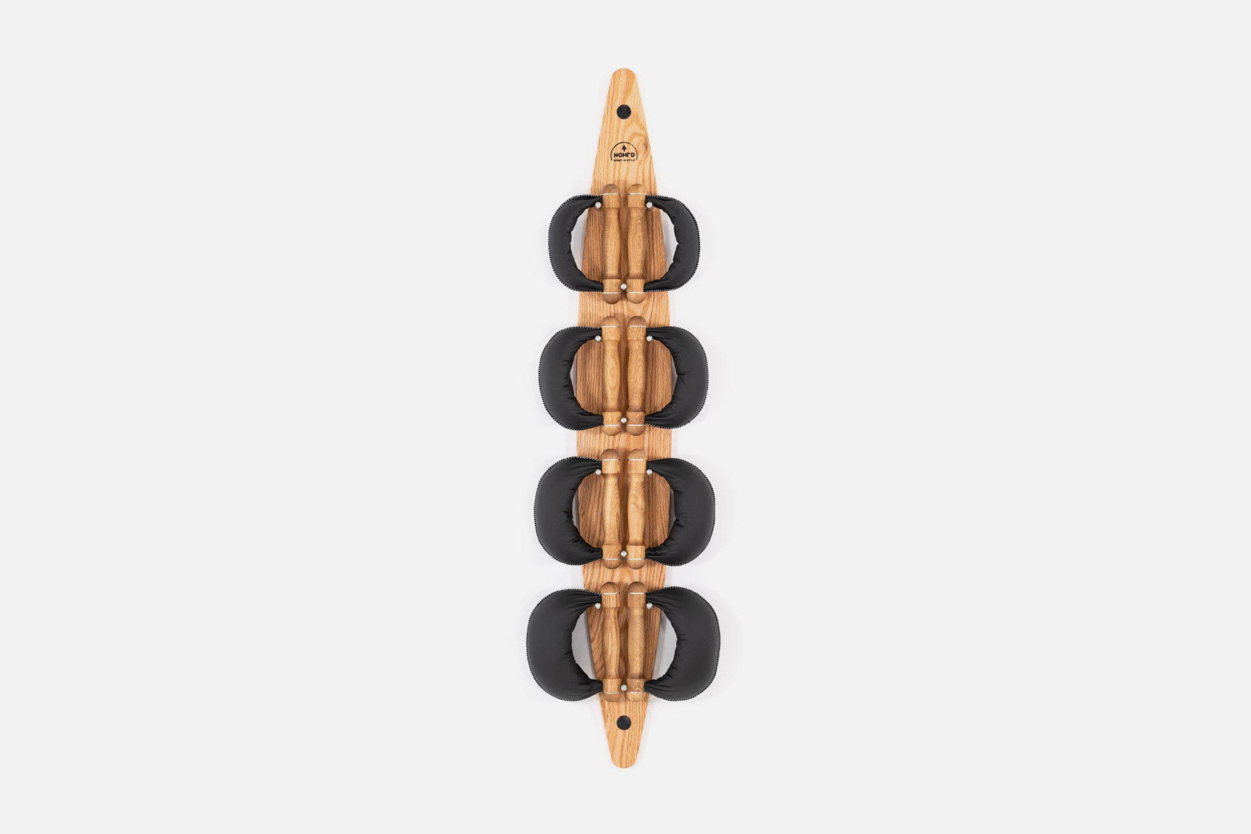 Store up to eight Swing dumbbells (in pairs: 2, 4, 6, 8 kg) effortlessly on the NOHRD SwingBoard. Made with care of highest quality wood and hand-stiched black genuine leather.