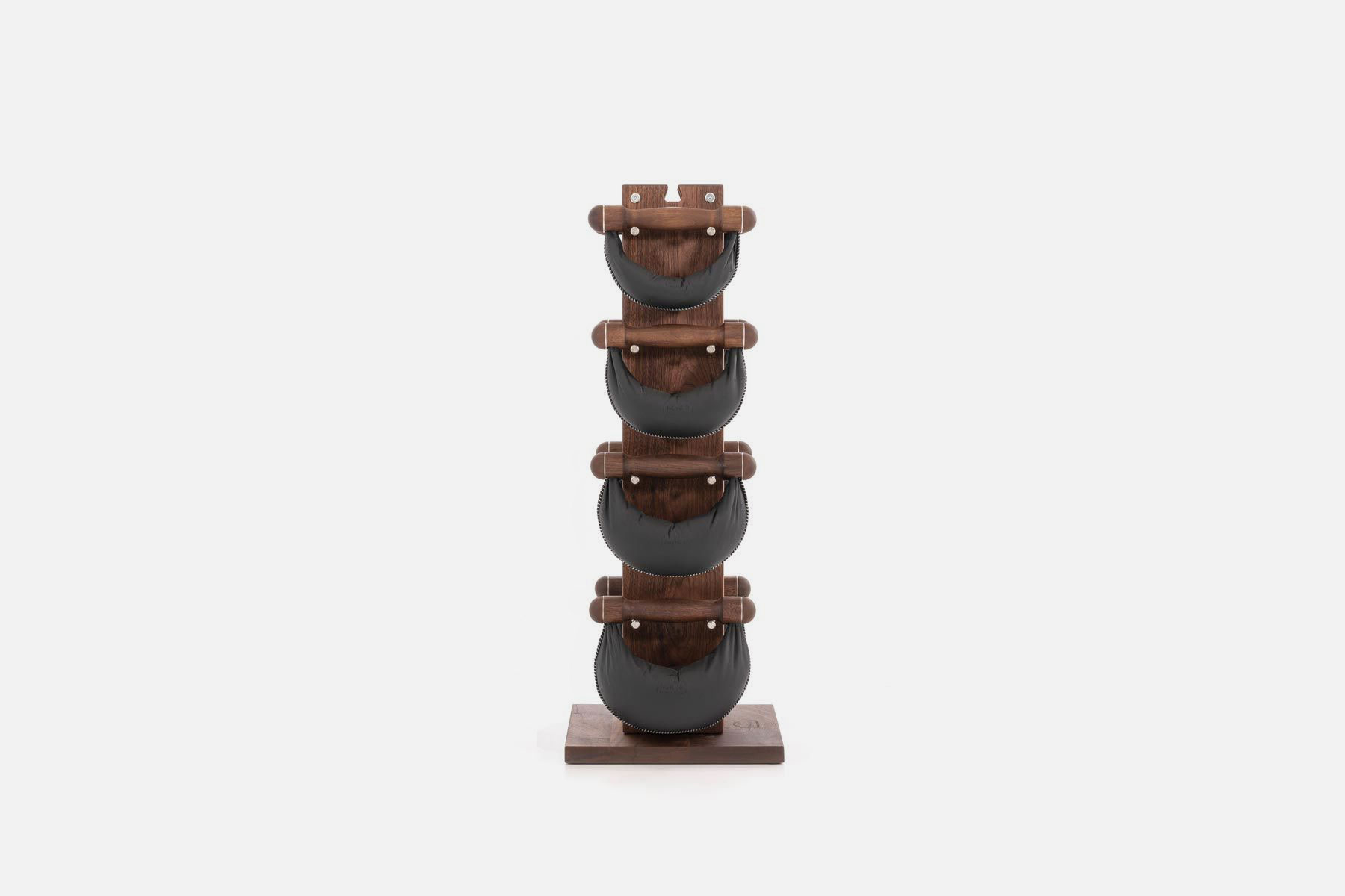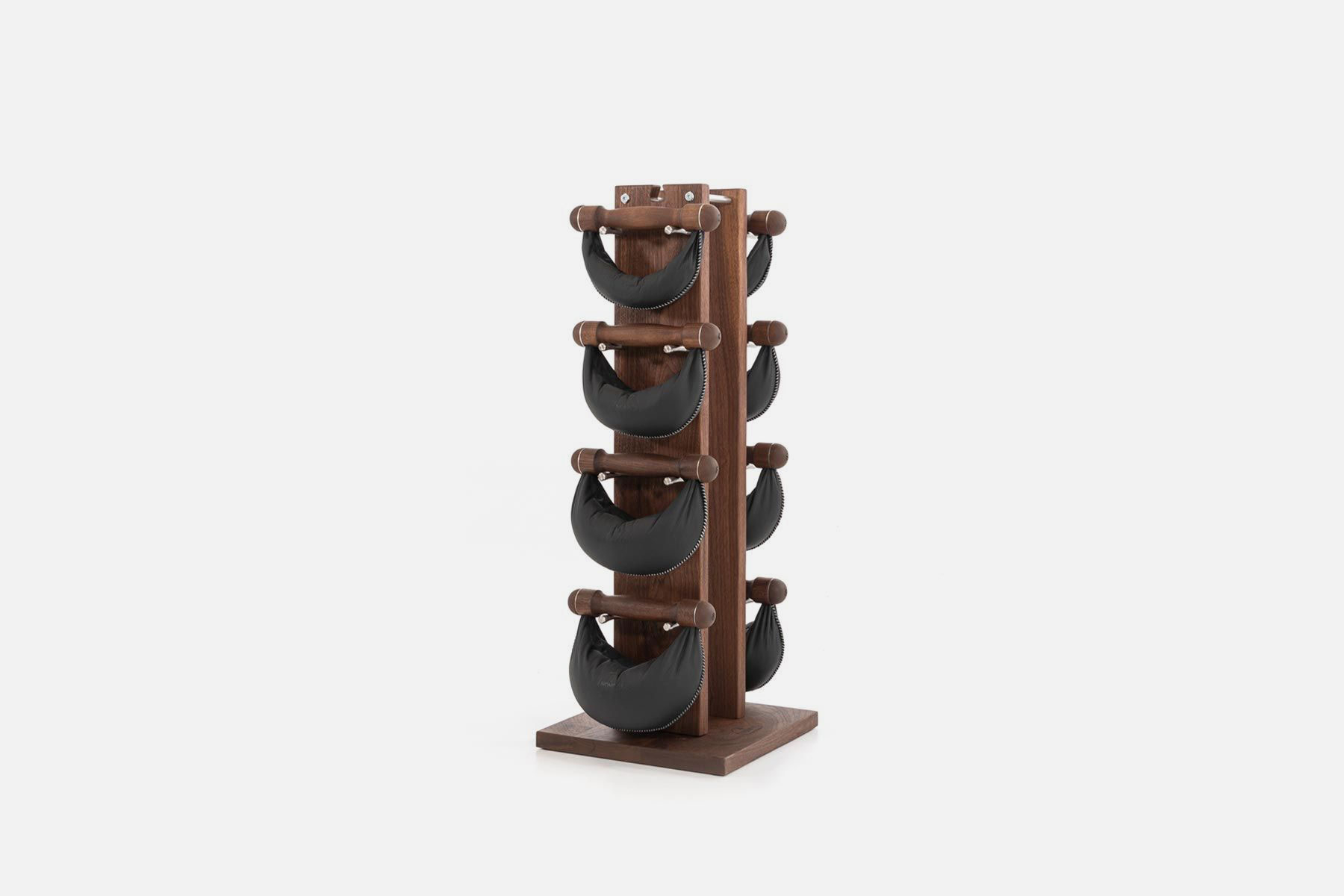 Handles made of solid wood, with hand-stitched genuine leather pouches – eight SwingBells hand weights (2 sets each of 2, 4, 6, 8 kg) are stored compact and upright on the Swing Tower.