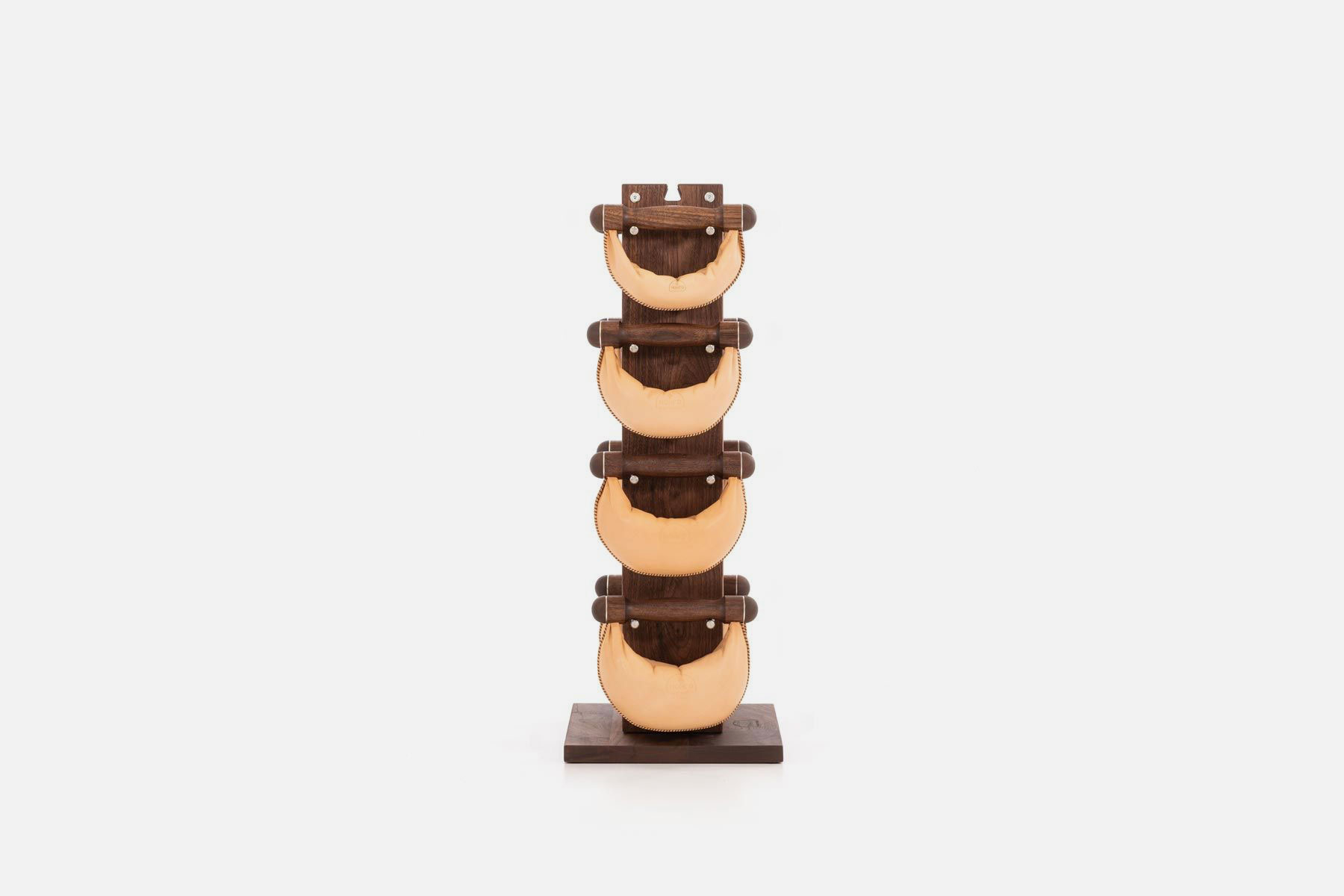The NOHRD Swing Tower, crafted from solid, oiled wood prioritizes sleek and subtle storage. The SwingBells free-weights can be securely removed and stored, as needed.
